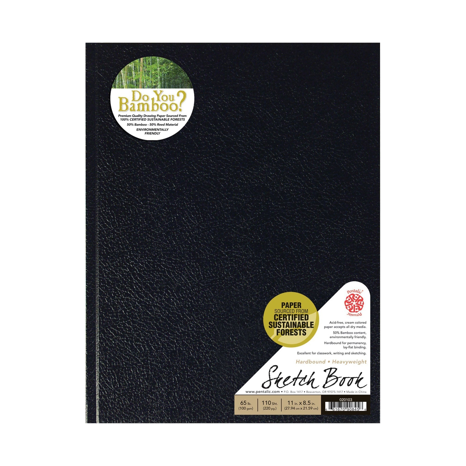 The Bamboo Hardbound Sketchbook contains paper made from 100% certified sustainable forests: 50% bamboo and 50% reed. Bamboo is a prolific renewable resource because of its quick growth cycles and heartiness. The hardcover construction and lay-flat binding of this sketchbook allows it to stand upright on a bookshelf. The sketchbook contains 220 pages of cream-colored 65 lb (110 g/m2) acid-free sketch paper excellent for use with all dry media. Cover has an embossed faux snake skin texture.